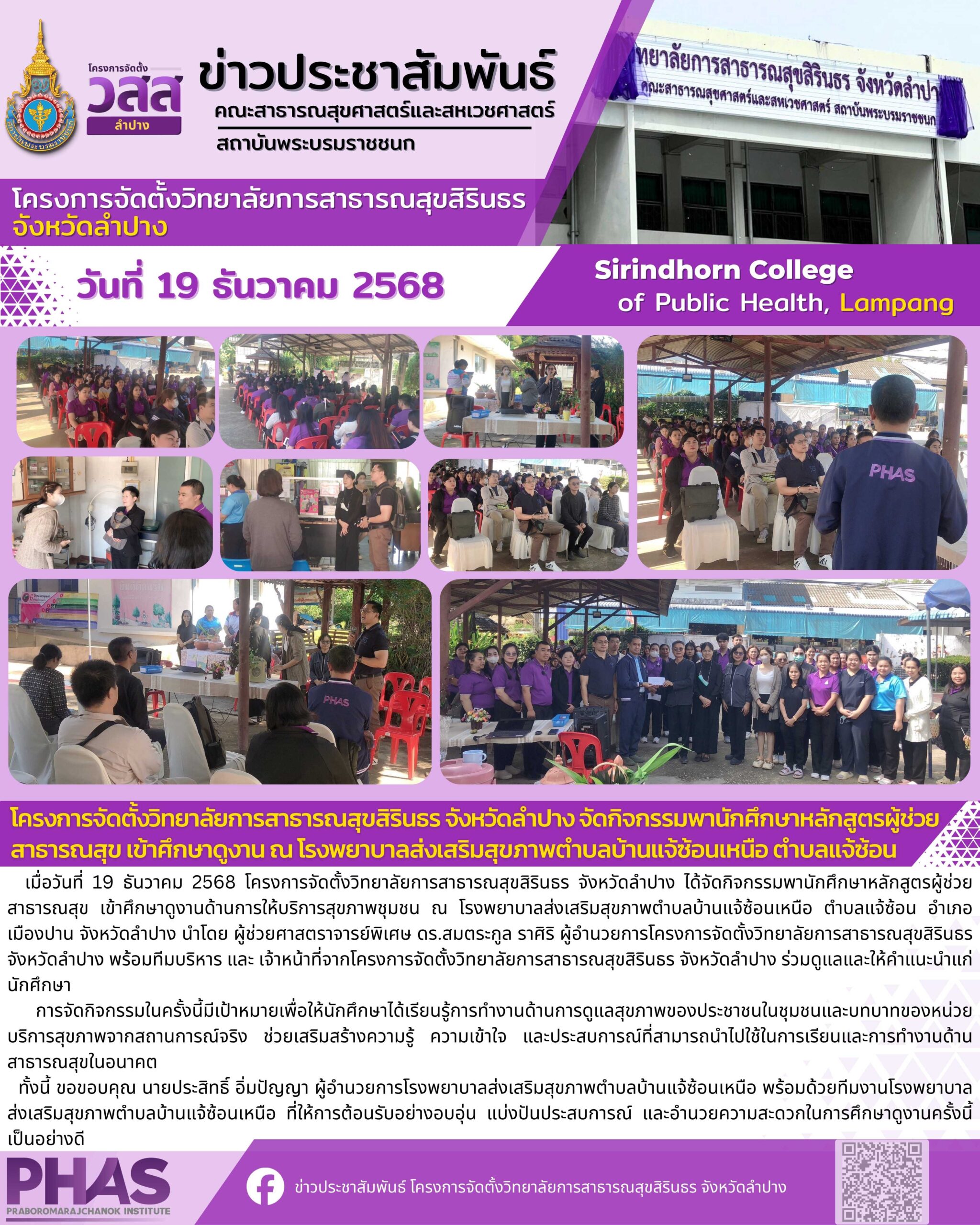 โครงการจัดตั้งวิทยาลัยการสาธารณสุขสิรินธร จังหวัดลำปาง จัดกิจกรรมพานักศึกษาหลักสูตรผู้ช่วยสาธารณสุข เข้าศึกษาดูงาน ณ โรงพยาบาลส่งเสริมสุขภาพตำบลบ้านแจ้ซ้อนเหนือ ตำบลแจ้ซ้อน